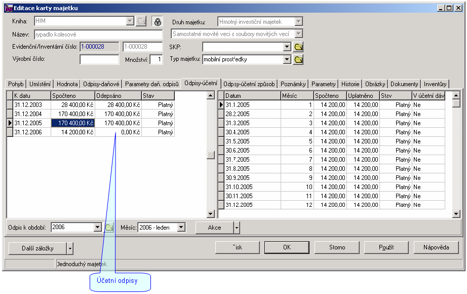 - informace o hodnotě majetku k datu, spočítané automaticky podle zapsaných finančních pohybů (pořízení, zhodnocení, …) a odpisů majetku